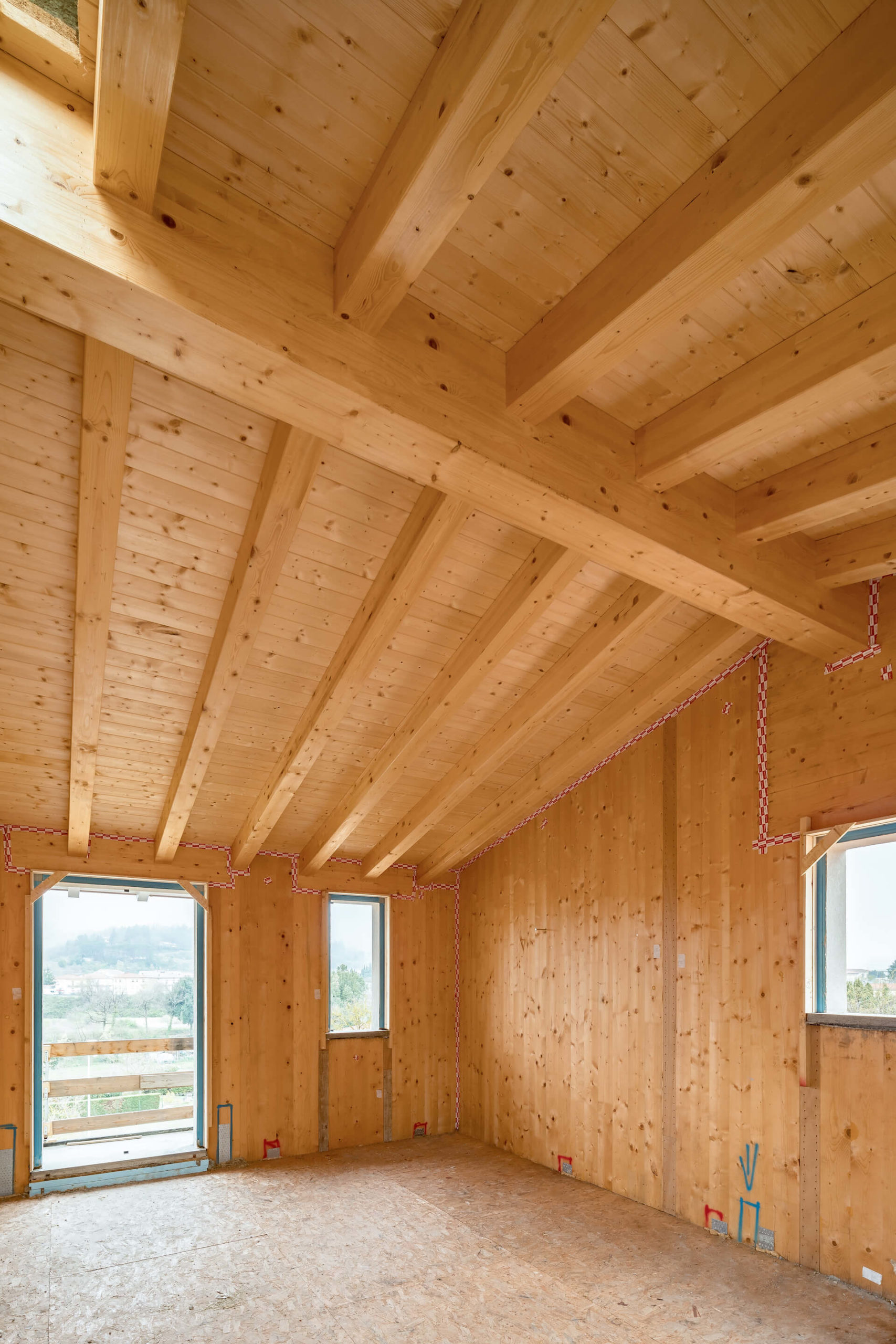 6. Impianti e finiture: completato l’involucro esterno della struttura, potremo dare avvio alla realizzazione degli impianti e delle finiture esterne e interne, come il rivestimento a cappotto e le partizioni in cartongesso, i cui dettagli costruttivi sono stati definiti in fase progettuale, in perfetta sintonia con le opere strutturali. Tutte le scelte costruttive sono volte a garantire il massimo risparmio energetico, dalle coibentazioni alle soluzioni impiantistiche: installiamo impianti di ultima generazione, alimentati da pompe di calore elettriche, con riscaldamento radiante a pavimento, ventilazione meccanica controllata (VMC), pannelli fotovoltaici e quant’altro permetta di  sfruttare pienamente i benefici esclusivi di una struttura in legno.